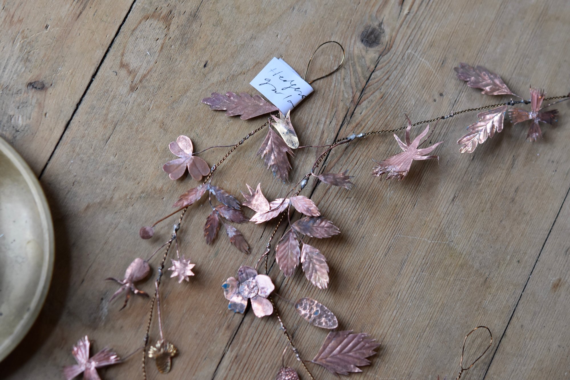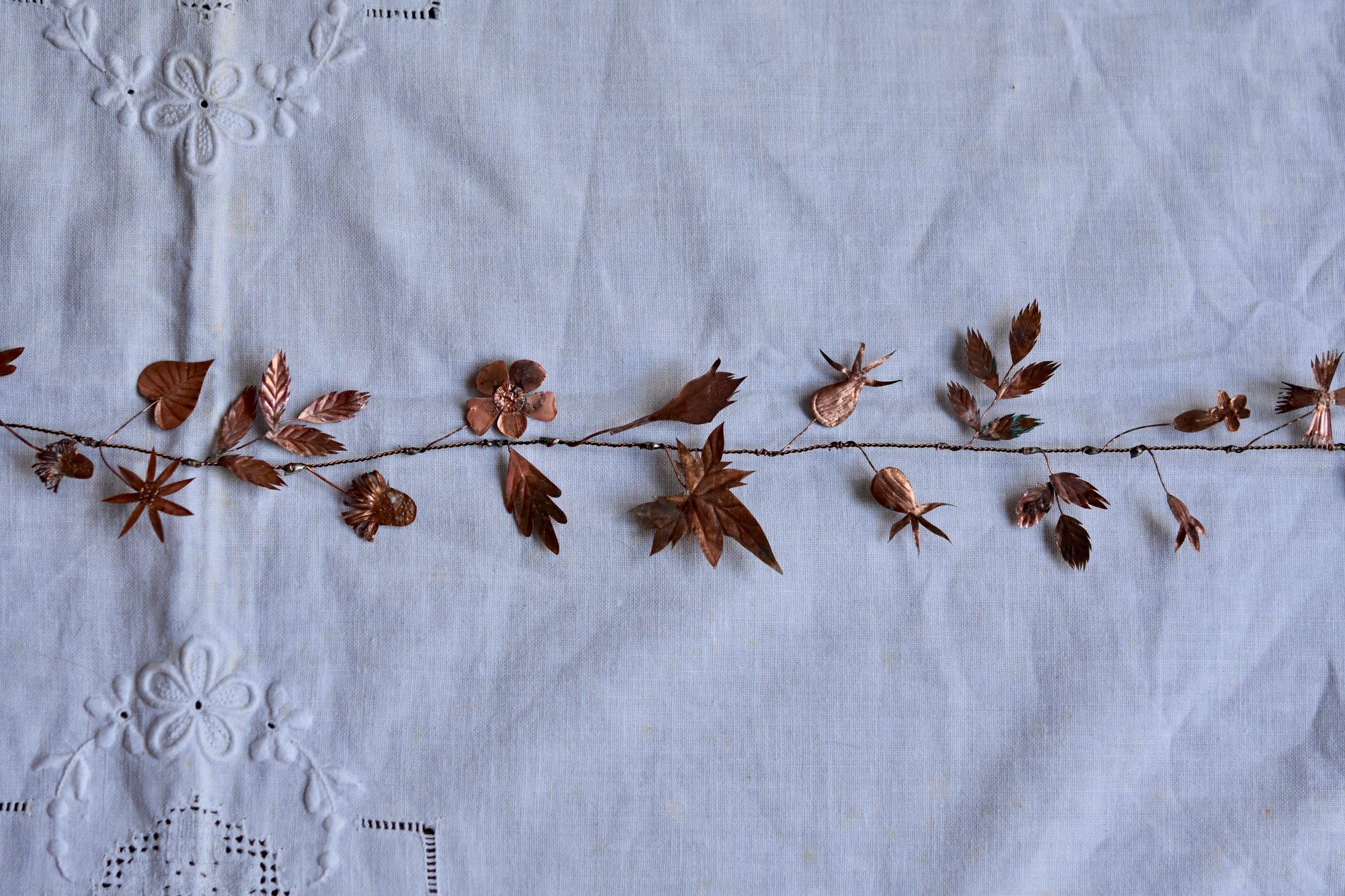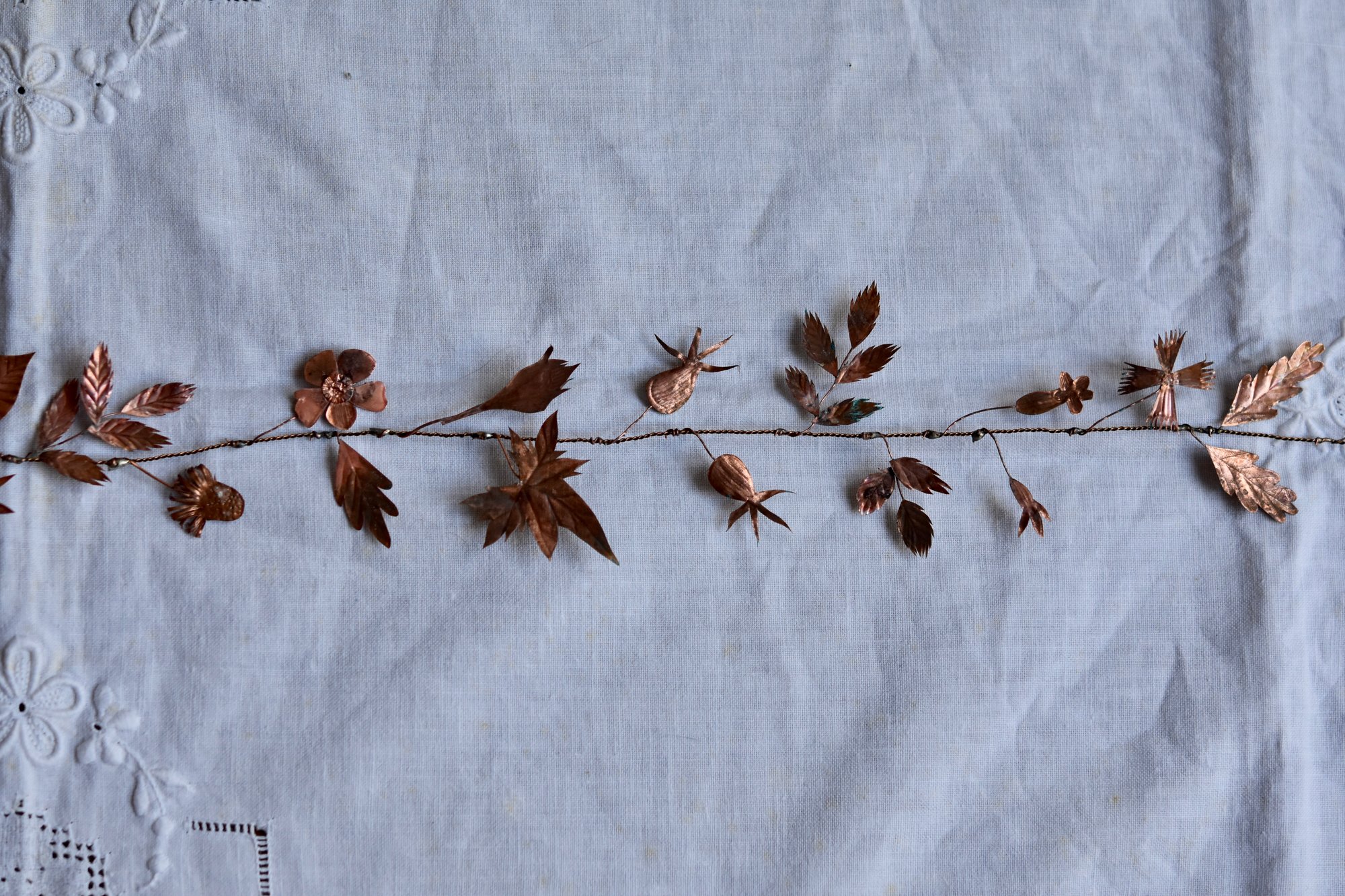 Very delicate copper and wire garland with an aged patina.