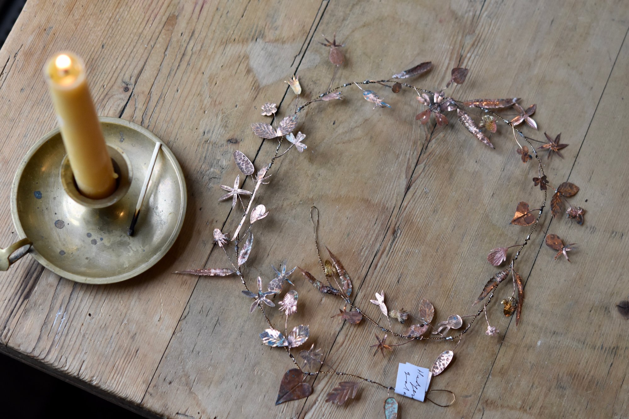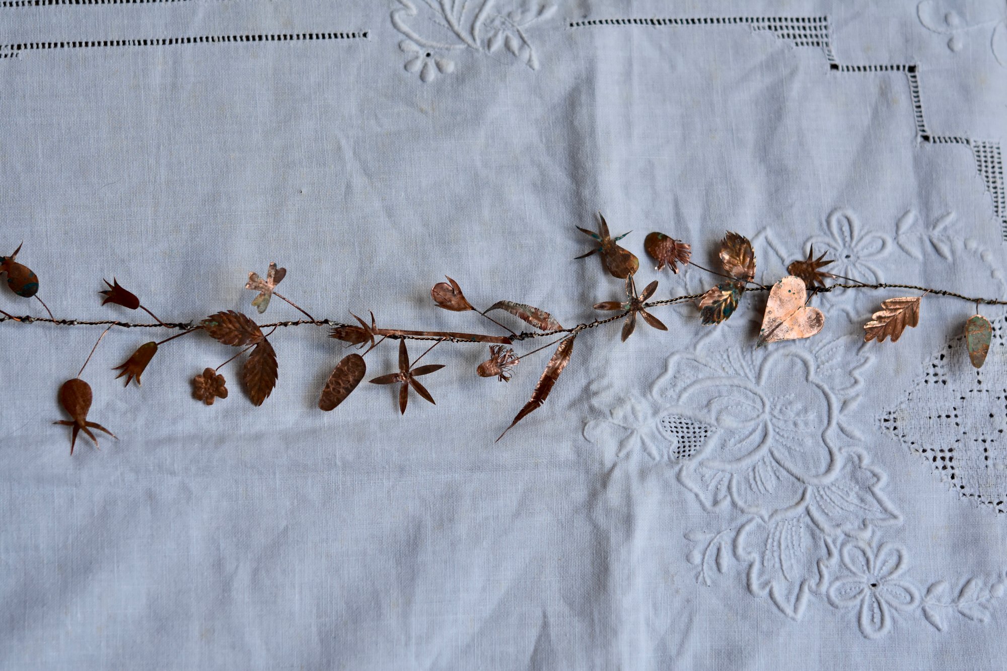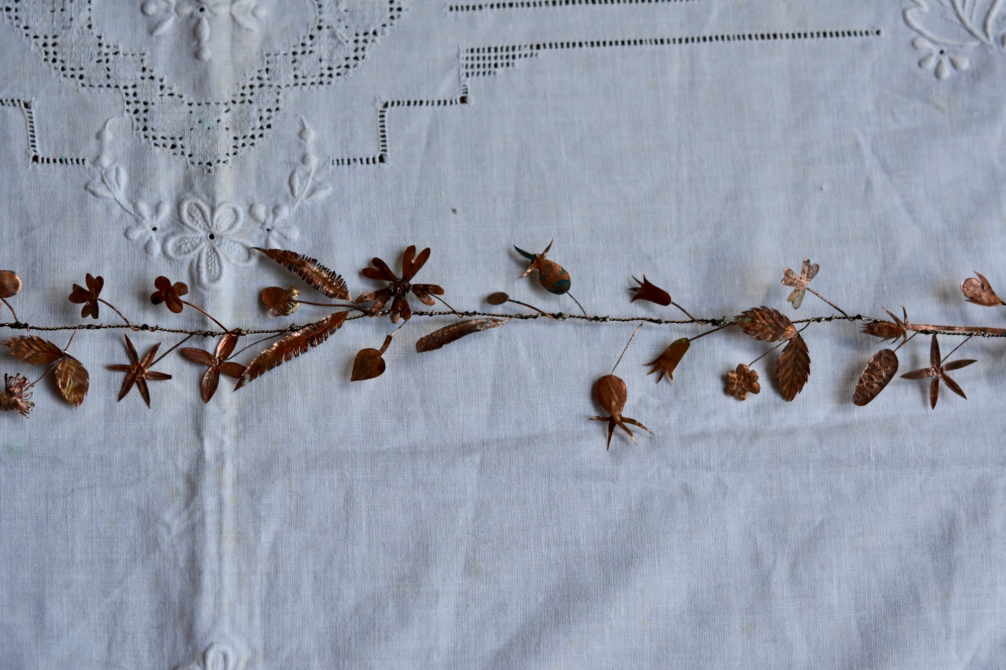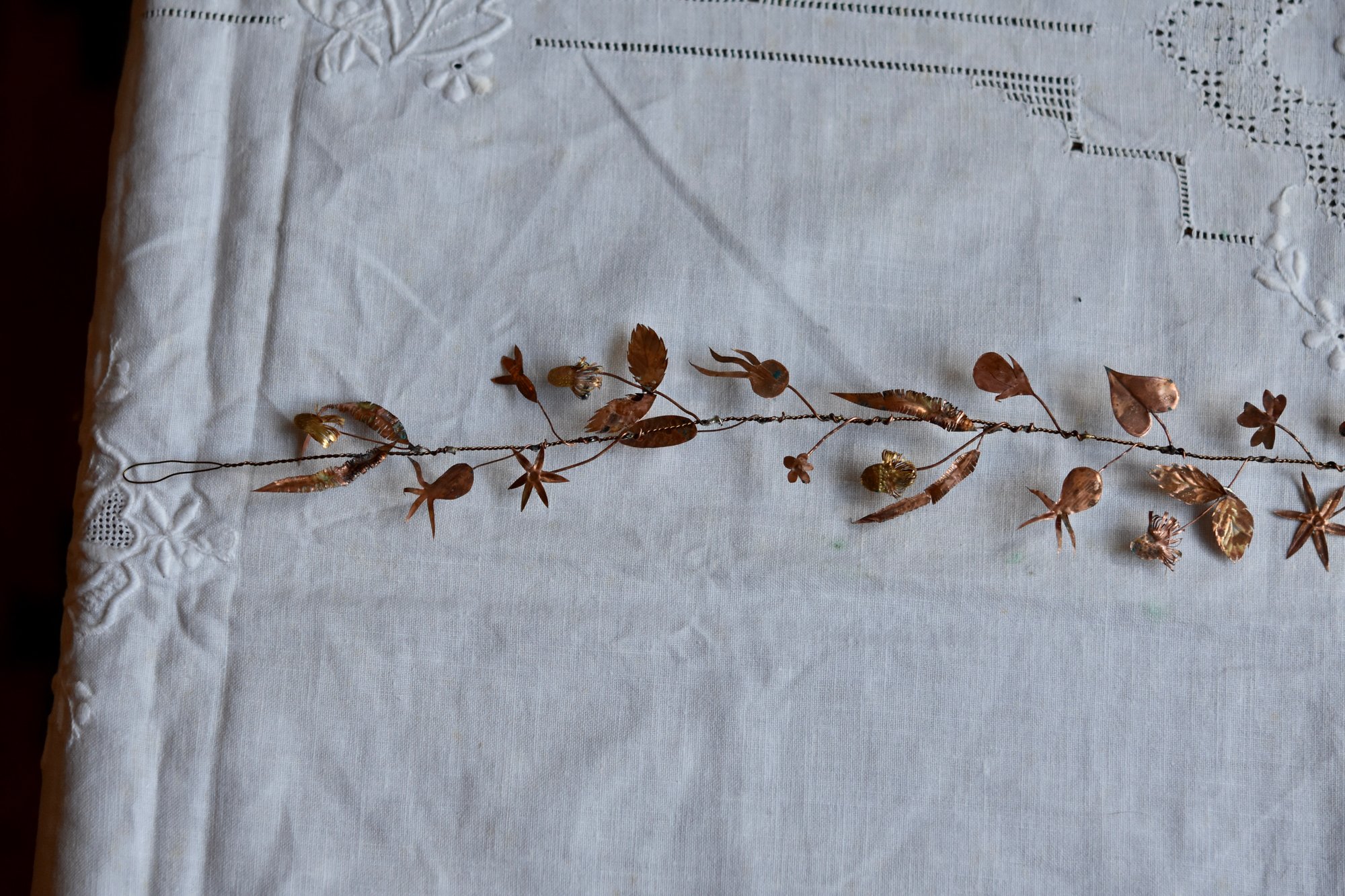 Very delicate copper and wire garland with an aged patina.