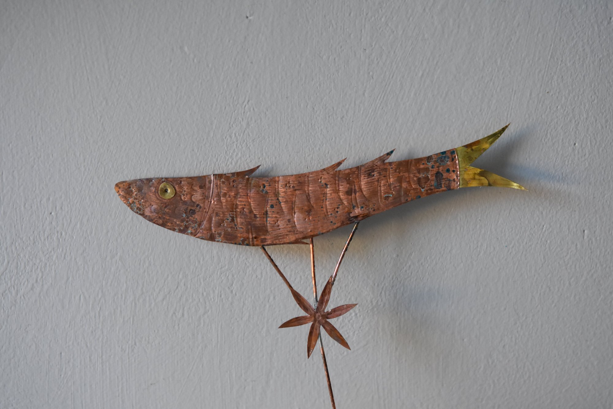Delicate copper, brass and wire fish with an aged patina.