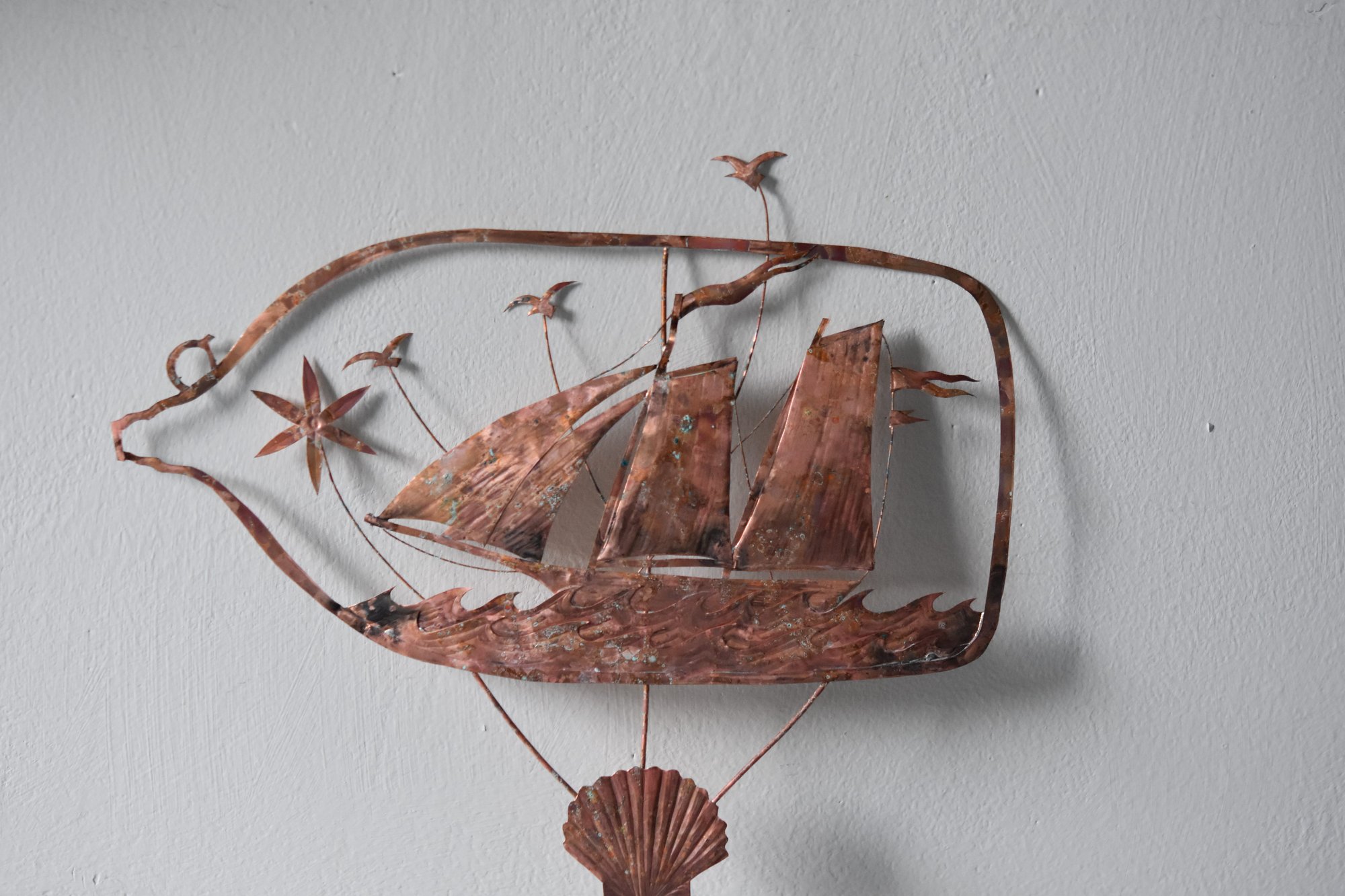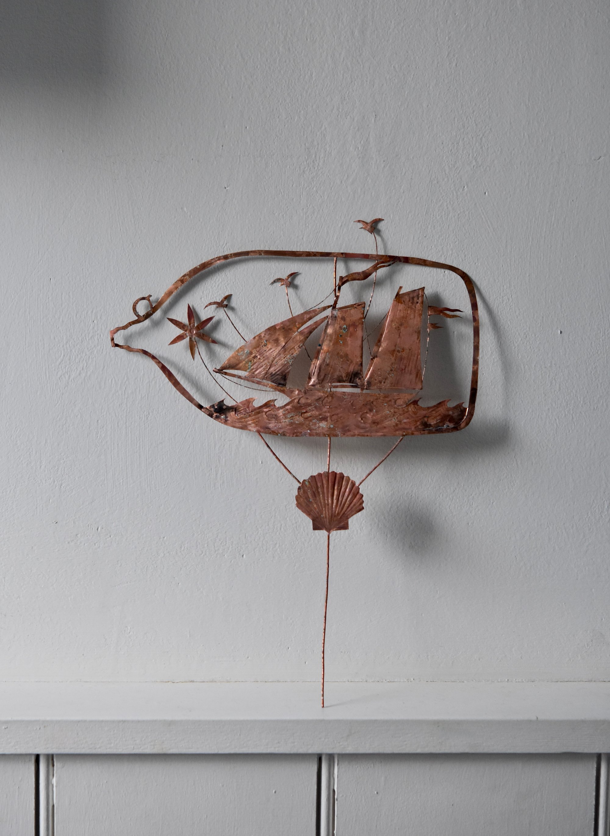 Delicate copper and wire sculpture with an aged patina