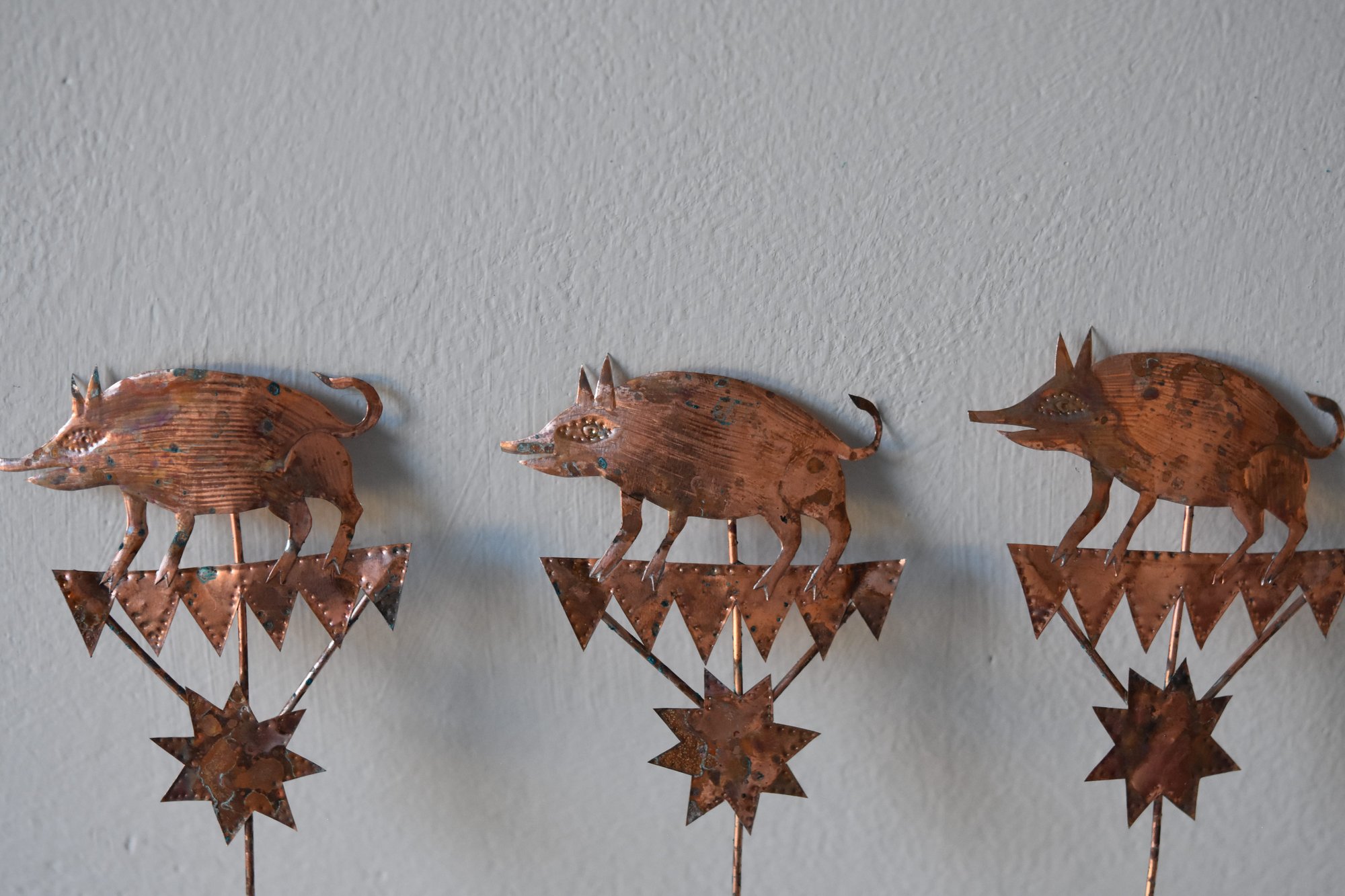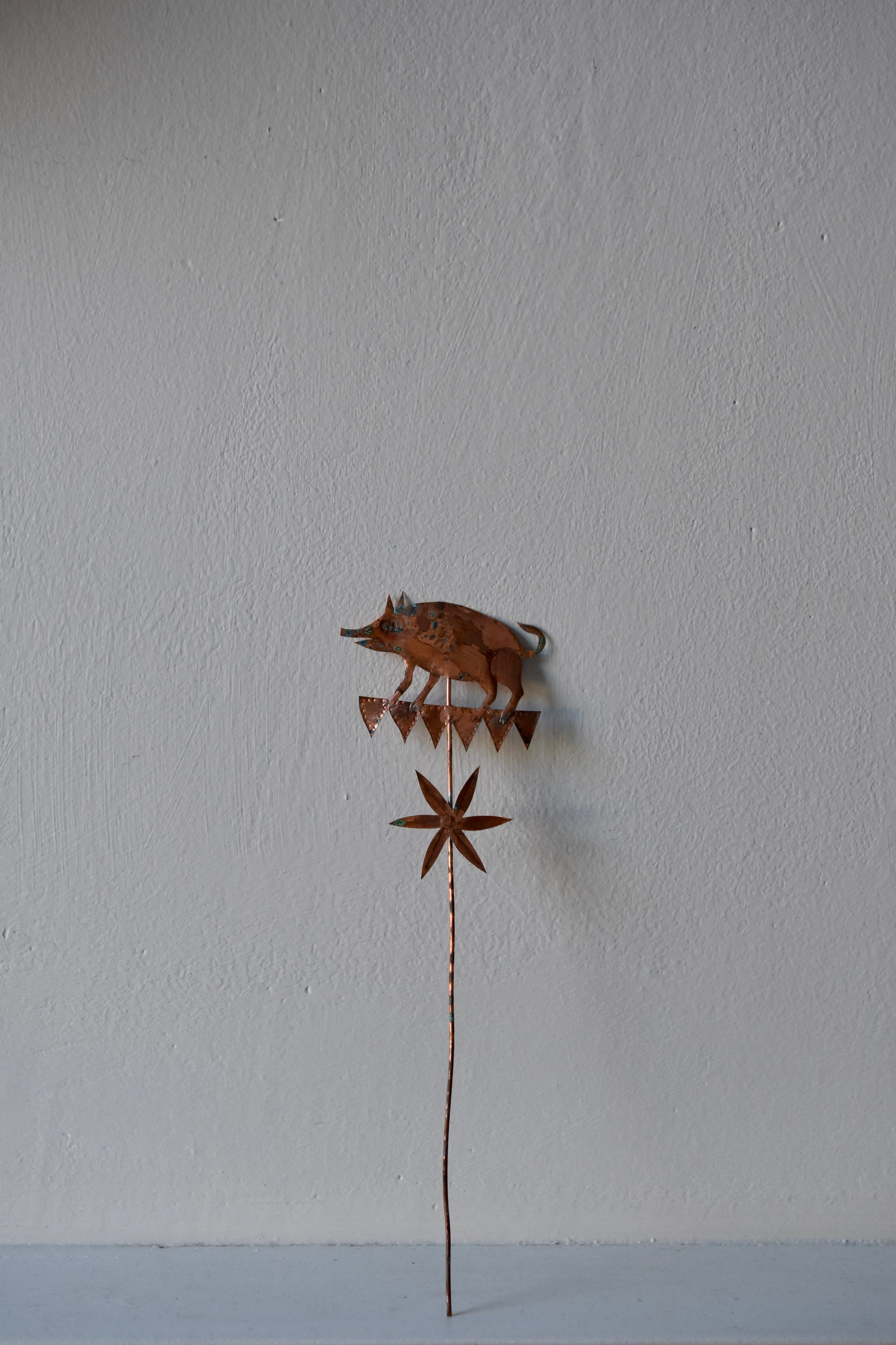 Delicate copper boar with an aged patina on a copper wire